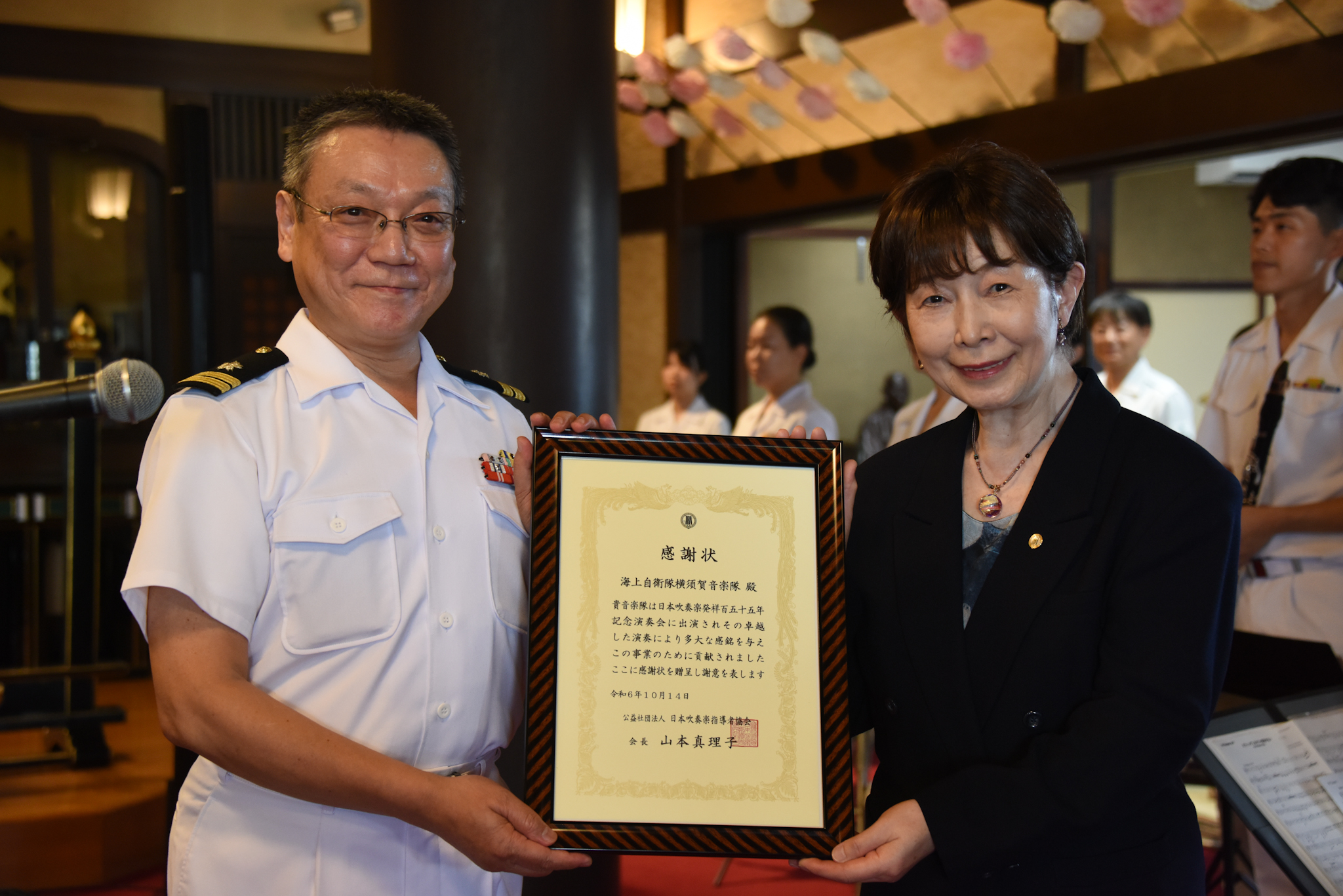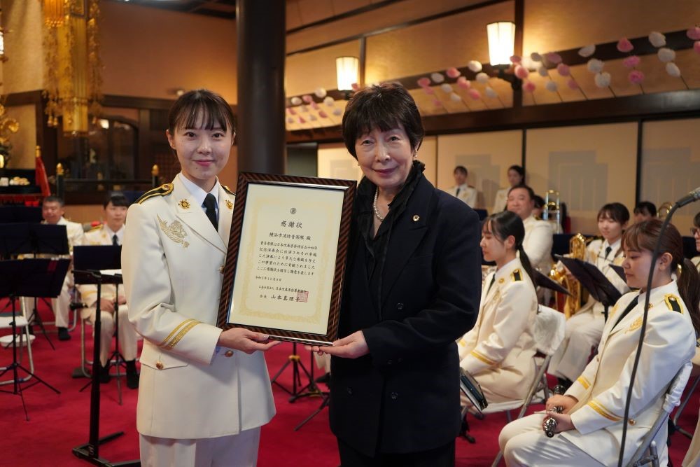 「赤とんぼ」、「ブルーライトヨコハマ」等、横浜市消防音楽隊の豊潤なサウンドで横浜を堪能できる演奏会となりました。終演後に山本真理子会長より横浜市消防音楽隊の皆様に感謝状の贈呈がありました。